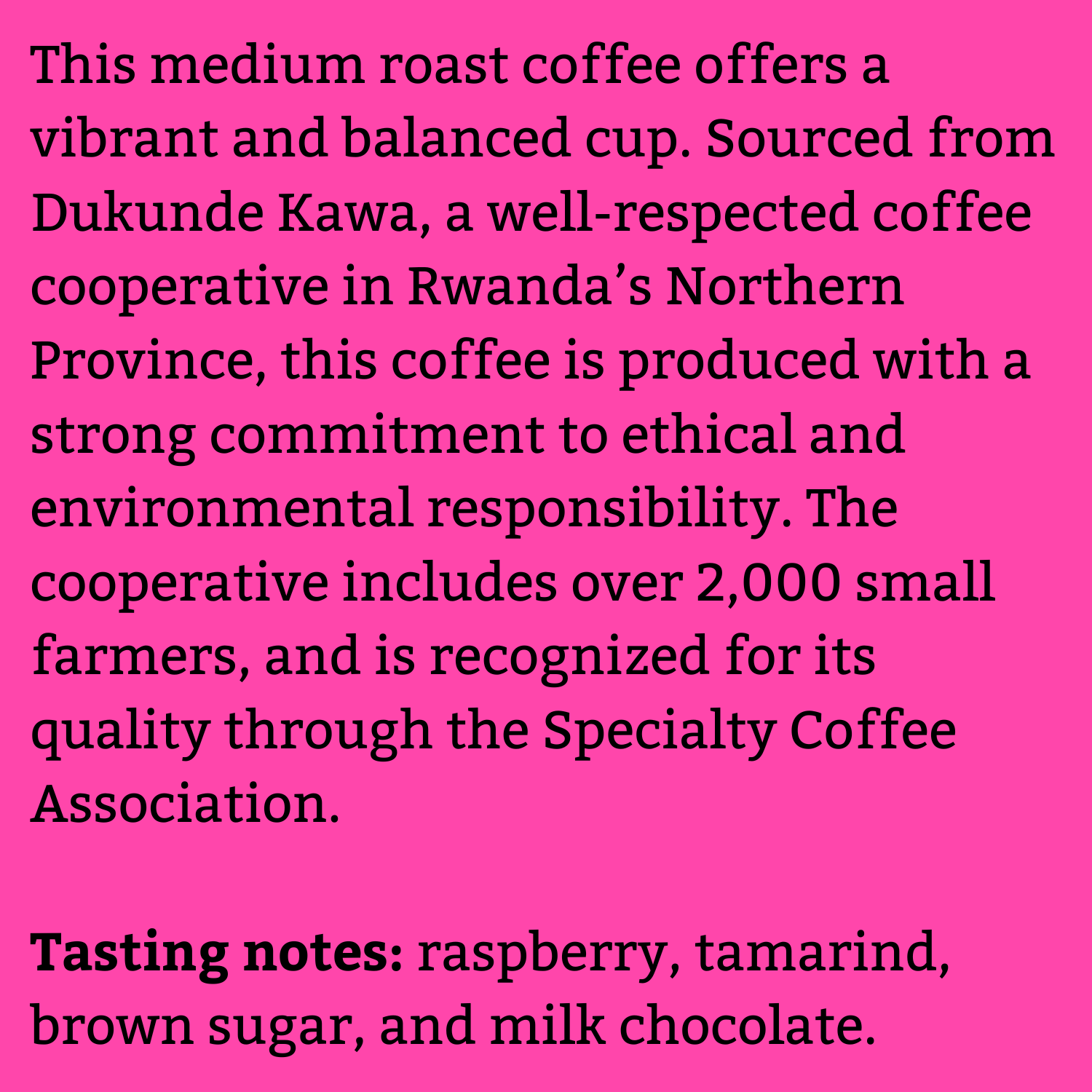 Medium Roast. With tasting notes of raspberry, tamarind, brown sugar, and milk chocolate, this coffee is a delight! From the importer: